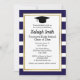Blue and white horizontal-striped, nautical-style graduation party invitation with a black graduation cap.