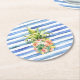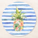 Blue White Stripes Tropical Floral Pineapple Round Paper Coaster