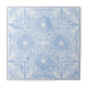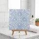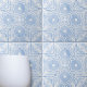 This ceramic tile features intricate symmetrical patterns painted in various shades of blue. The central design, resembling a flower or star shape, is surrounded by ornate lines and curves, creating a captivating visual effect. At each corner of the tile, there are four similar designs that appear to be abstract representations of leaves or flowers. These designs, combined with the lighter background colour, allow the darker blue patterns to stand out prominently. The style of this tile is a unique fusion of traditional ceramic art and modern aesthetics. The intricate designs and soothing shades of blue evoke a sense of tranquillity, reminiscent of the serene waves of the sea. This tile is a perfect piece to add elegance and charm to any space.