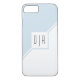 Light blue and white geometric iPhone 8/7 Case with monogram. The front includes two diagonal stripes one blue-grey and one white that separate the card in two triangles. A white square is on the centre with your monogram.