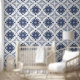Easy to install peel and stick wallpaper with navy blue and white watercolor Mediterranean tile pattern inspired by Portuguese Azulejo, featuring an original illustration of elegant nature motifs. With its modern yet classic design with intricate details, this wallpaper is perfect for bathroom, kitchen, living or dining room wall. Bring timeless sophistication to your home interior design with this stunning tile patterned wallpaper, effortlessly blending tradition with a contemporary flair, creating a stylish and inviting living space.