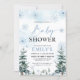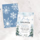 Winter Wonderland Baby shower invitation with blue snowflakes and pine trees, and boho design.