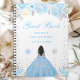 This elegant and glamourous guest book features a beautiful princess with dark hair and dark skin in a blue ball gown. The text combines handwritten script and modern sans serif fonts for a classy and sophisticated look. The floral arrangements, snowflakes and silver confetti create the perfect blend of rustic and chic. Perfect for a winter themed birthday party.