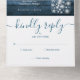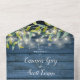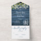 All in one wedding invitation featuring greenery foliage, pretty string lights, mason jars, signature style names and chic typography on a blue rustic wood background. The invitation includes a perforated RSVP card that’s can be individually addressed or left blank for you to handwrite your guest's address details. Designed by Thisisnotme©