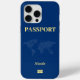 Blue and yellow passport phone case with world map. Personalise it with your name. Great for a pilot, a vacation or a frequent traveller.