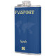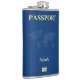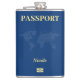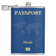 Blue and yellow passport playing flask with world map.  Personalise it with your name.  Great for a pilot, a vacation or a frequent traveller.