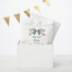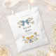 Boho bow theme bridal shower favour bag featuring hand drawn illustration of blue and yellow ribbon and flowers.