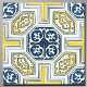 A vintage, geometric tile art pattern with flowers and leaves in blue, white and yellow, with a hand-painted look.