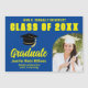 This modern blue and yellow custom senior graduation announcement magnet card with graduate photo under modern arch. It features classic typography of your college name for the class of 2025 and varsity letters. Customise with your graduating year under the chic handwritten script and black grad cap for great postcards. Add your party details on the back.