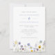 A pretty wedding invitation in blue and yellow perfect for a spring wedding, featuring a watercolor wildflowers and pansies in blue and yellow, with green leaves, on a white background. Personalise with your details in blue and grey.