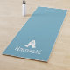 Blue yoga mat with Namasté hands together icon. Personalised accessories for yoga classes and lessons. Stylish Birthday gift idea for yoga lessons teacher, meditation therapist, school, class trainer, zen coach, groups or gym instructor. Fun personal fitness equipment for him or her. Add your own logo sign, name or monogram letters. Sports material for him or her. Stylish typography template. Create mats for yoga poses, stretching, floor exercises, sit-ups, meditation, therapy and more. Customisable background colour. Light, easy to roll up. 1/4 inch thickness.