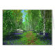 An overgrown path meandering through the birch forest on a sunny summer day. In the shade of the trees cluster carpets of bluebells in shades of blue and purple contrasting with the spring green of the grass and birches.