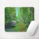 An overgrown path meandering through the birch forest on a sunny summer day. In the shade of the trees cluster carpets of bluebells in shades of blue and purple contrasting with the spring green of the grass and birches.