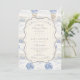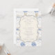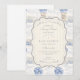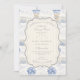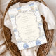 A sweet vintage-inspired design featuring delicate blue bows, soft striped detailing, and charming blueberry garden illustrations. Toile-style artwork with adorable animals and fruit baskets creates a classic storybook feel in a soft powder blue palette. The ornate central frame adds elegance while keeping the overall look light, refined, and timeless. Perfect for a baby shower with a gentle garden theme and a touch of traditional charm.