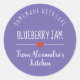 Modern "homemade with love" sticker featuring "blueberry jam" with a white font on a purple background embellished by a cute red heart. Customise text.