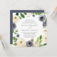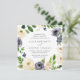 Our square shaped Blueberry Lane wedding invitation surrounds your wedding day details with a wreath of watercolor blossoms and berries in ivory and indigo blue, accented with lush green botanical leaves and foliage.