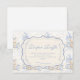 A sweet vintage-inspired design featuring delicate blue bows, soft striped detailing, and charming blueberry garden illustrations. Toile-style artwork with adorable animals and fruit baskets creates a classic storybook feel in a soft powder blue palette. The ornate central frame adds elegance while keeping the overall look light, refined, and timeless. Perfect for a baby shower with a gentle garden theme and a touch of traditional charm.