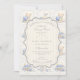 A sweet vintage-inspired design featuring delicate blue bows, soft striped detailing, and charming blueberry garden illustrations. Toile-style artwork with adorable animals and fruit baskets creates a classic storybook feel in a soft powder blue palette. The ornate central frame adds elegance while keeping the overall look light, refined, and timeless. Perfect for a baby shower with a gentle garden theme and a touch of traditional charm.