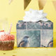 Bluebird sitting on cherry blossom branch by a rainy window with a pink border.