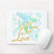Pretty blue bird, hearts, flowers, and ribbon design of blue and mint green with golden text that reads "Mum is Love" on mum T-shirts, tote bags, mousepads, magnets, and other mum gifts and apparel.