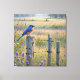 A bluebird is perched on a weathered wooden fence post with barbed wire surrounded by tall grass and purple wildflowers