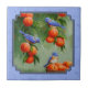 Two western bluebirds perch in a peach tree while a third bluebird sits on a woven wooden basket filled with freshly harvested fruit ready for market. Accented with a matching blue patterned background.