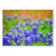 Bluebonnets against a soft green and red background. Created from a digital photo and altered to resemble an image on canvas.