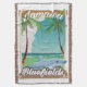 Bluefields, Jamaican travel poster of the sandy white beach and palm trees.