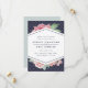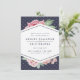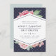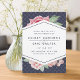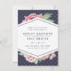 Elegant save the date cards feature a chic mix of vintage watercolor florals and modern geometric elements on a subtly patterned midnight blue background. A spray of blush pink watercolor peony flowers peeks out from the top and bottom of a central diamond shaped element outlined in midnight blue, holding your names and wedding details in clean, modern lettering.