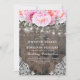 Rustic vintage wedding invitation features pink and blush watercolor flowers, string lights, lace, and barn wood