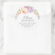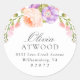 Pretty feminine circle return address stickers personalised with your name and address bordered by pastel peach pink and lavender purple watercolor flowers and greenery. Use the design tools to change the background colour and fonts to further customise your own unique design.