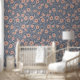 Beautiful modern floral wallpaper with a pattern of blush flowers in a simple modern style with vines and leaves in silver gray curling like tendrils around the pretty flowers against a muted dark blue background. This blush and blue floral wallpaper will look great in your home. Why not in your living room or your bedroom, either the whole room or as a gorgeous accent wall.