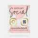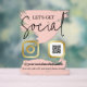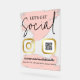 Acrylic let's get social sign with printed blush pink brushstrokes, your QR code and faux gold social media icon personalised with your social media handle. Social media promotional sign with black fonts and blush pink paint strokes printed on an acrylic background personalised with your QR code so your clients and customers can easily access your social media.