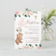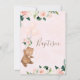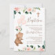 Sweet bear themed girl's baptism invitation featuring a brown bear, three pink balloons and various floral arrangements and pink dots. This bear themed baptism invitation also features a faux rose gold cross and is a cute way to invite guests to a girl's baptism.
