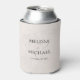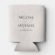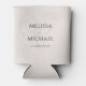 This design features elegant blush floral greenery leaves can cooler, with bride and groom names, with stylish trendy calligraphy ampersand, a wedding reception party favour, great for wedding barware drinkware drink, botanical flower green leaves leaf, a classic traditional wedding style, a simple party reception guest favour, watercolor greenery with floral design, a great wedding favour can beverage holder