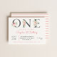 Pretty blush pink watercolor flowers and delicate greenery adorned bold type letters, 1st birthday invitation. Cute and girly floral "ONE" with trendy typography design. Back of card features coordinating pink watercolor stripe pattern.