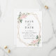 Invite friends and family in style and set the tone for your special day with this charming save the date card. Design features blush pink watercolor flowers, greenery and gold frame on white background.