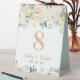 Woodsy romantic style wedding table number cards feature numbers framed by a floral watercolor wreath with painted roses, ranunculus flowers, and leaves. Colour scheme includes neutral spring and summer shades of white, cream, blush pink, gold, and green.