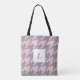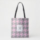 A modern take on a traditional oversized houndstooth pattern in pink and grey with custom monogram on both sides.