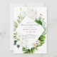 Blush pink and tropical greenery summer watercolor floral bachelorette party invite white orchids, white king proteas, magnolias, eucalyptus and deep greenery.