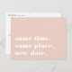 Need to postpone or reschedule your wedding? Let guests know with these modern and lighthearted postcards in chic blush pink with crisp white lettering. Funny and clever typography-based design features "same time, same place, new date" on front, with your new wedding date and details on the back.