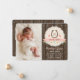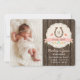 Add your three favourite pictures on the front and back of this sweet western baby photo birth announcement. Monogram the front of the card with your baby girl's initial inside the horseshoe design. Add your own wording to the pale peachy pink blush banner with a floral laurel wreath beneath it with roses, sunflowers and cherry blossom and dogwood branch with berries. It currently says, Howdy, Y'all A wood fence and barrel background with nail head trim completes this cute country and rustic themed birth announcement. Perfect for the proud parents who love a cowgirl, farm, farmhouse, rodeo, barn house or vintage themed design. Artwork © Chrissy H. Studios, LLC. All rights reserved.
