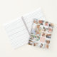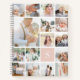 Customise this spiral notebook with 16 square photos arranged in a grid collage layout, with one large image and the remainder small. Your single initial monogram appears on a blush pink square at the lower right. Back cover has tone on tone stripes in millennial pink.