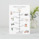 Rustic colourful watercolor illustrated wedding day elements, timeline program. Card features church, camera, bottle with glass, plate setting, music notes, cake, bouquet, and retro car. Back of card features watercolor navy blue, white and blush floral and foliage border.