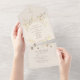 This all-in-one wedding invitation features a soft neutral background with blush and gold floral accents, combining your invitation and RSVP into one elegant, convenient design. The foldable layout with pre-addressed RSVP panel is ideal for rustic, romantic, and botanical weddings seeking simplicity and charm.
