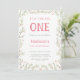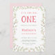 This 1st birthday invitation features a pink and green blossom floral frame adorned with butterflies.