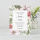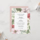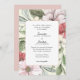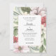 This wedding invitation features a autumn floral and greenery background using the colours, blush pink, sage green, and dark rose. The back side is a solid blue pink. The invite is perfect for a summer or fall wedding.