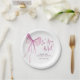 Each paper plate showcases a delightful design set against a pristine white backdrop. This bright and fresh canvas covers the entire surface of the plate, allowing all the elements to truly stand out. A beautiful blush pink bow takes a prominent place, its delicate form symbolising the joyous union and adding a sweet, romantic accent that pops beautifully against the white. The celebratory phrase "She's tying the knot" is gracefully incorporated, setting the theme perfectly. Below this, you'll find space to personalise with the Guest of Honour's Name, ensuring a personal touch. The words "Bridal Shower" are elegantly presented in a refined script, and the date of the event is also included, completing this thoughtful design. The overall aesthetic is one of pure romance, love, and charming simplicity, making these plates a beautiful complement to your table setting.