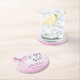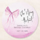 Each round paper coaster features a soft and inviting pink watercolor backdrop that forms the base of the entire design. This artistic wash of pink includes subtle variations and textures inherent in watercolor painting, giving the coaster a luxurious, hand-painted feel. A beautiful blush pink watercolor bow takes a prominent place, its delicate strokes symbolising the joyous union and adding a sweet, romantic accent. The celebratory phrase "She's tying the knot" is gracefully incorporated, setting the theme perfectly. Below this, you'll find space to personalise with the Guest of Honour's Name, ensuring a personal touch. The words "Bridal Shower" are elegantly presented in a refined script, and the date of the event is also included, completing this thoughtful design. The overall aesthetic is one of pure romance and charming detail.