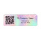 A trendy holographic background with unicorn colours and rainbow colours in blush pink, purple, mint green. Decorated with confetti. Personalise and add your own QR code to your own website or social media account, name and return address.
